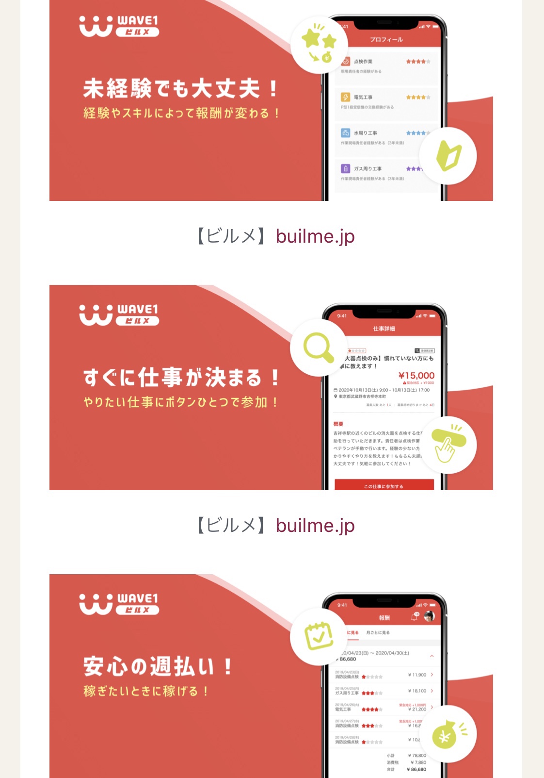 しかし、消防設備業界は長年の間異常な人材不足に悩まされています。その悩みを解消する為に生まれたのがWAVE1の消防設備業の為のお仕事マッチングサービス「ビルメ」です。いわゆる消防設備版「タイミー」みたいな感じです。普通の派遣サービスと比べてメリットはワーカーのレベルが一目で分かる、ドタキャンのリスクを減らす工夫を凝らしている。企業側さえよければワーカーを正社員に登用するのもOKという画期的な点です。