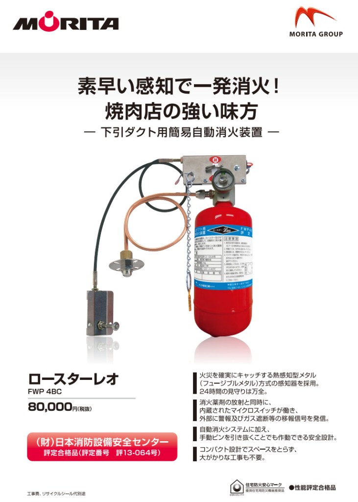 今回、交換工事をした下引きダクト消火設備(ロースターLeo)の定価は80,000円(税抜)です。
