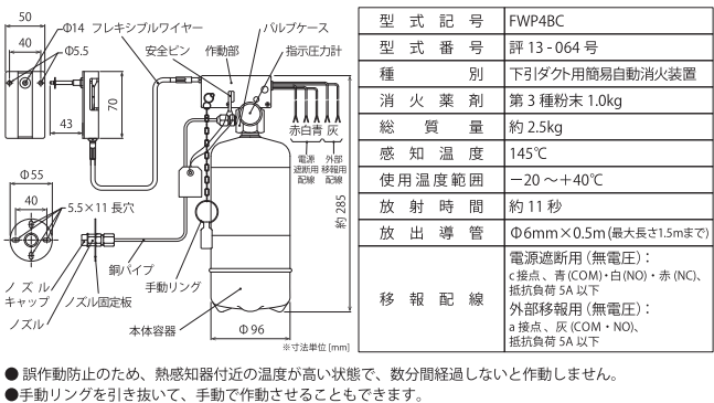 ちなみに、手動ピンを引き抜くと消火薬剤が放射されます。