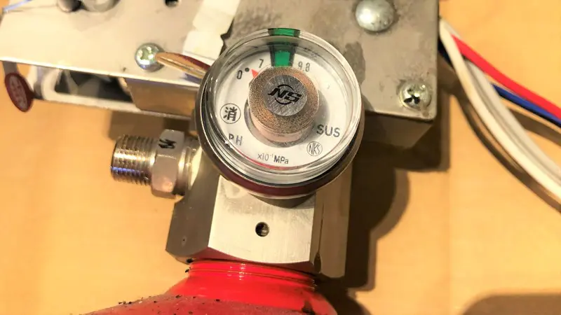 指示圧力計(蓄圧ゲージ)は、緑色範囲内の7~9.8 (×10^-1MPa)の値を示していなければなりません。