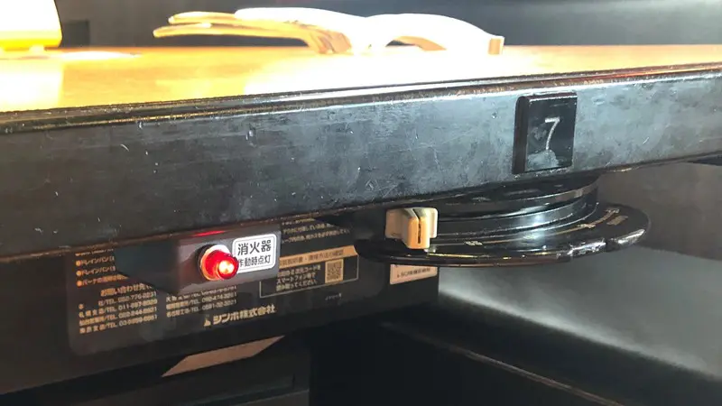 各テーブルにある「消火器 作動時点灯」の赤色灯が点灯している箇所の無煙ロースターに設置されている下引きダクト消火設備を交換しました。